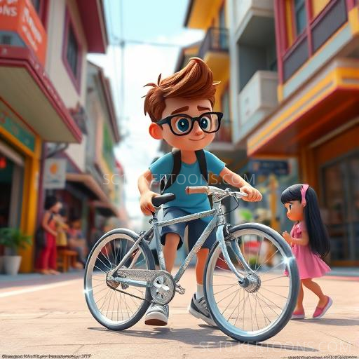 Just as Benny hesitated, the bicycle softly whispered, 'Would you like to go on an adventure?' Benny’s eyes widened—was this real? At that moment, Lily, a cheerful girl with her new bicycle, pedaled by. Seeing Benny’s puzzled face, she stopped and asked, 'Is that bicycle magic?' Benny nodded shyly. Together, they decided to hop on, feeling a mix of excitement and nervousness. With a gentle hum, the bicycle promised to take them on a special journey, if they trusted it.
