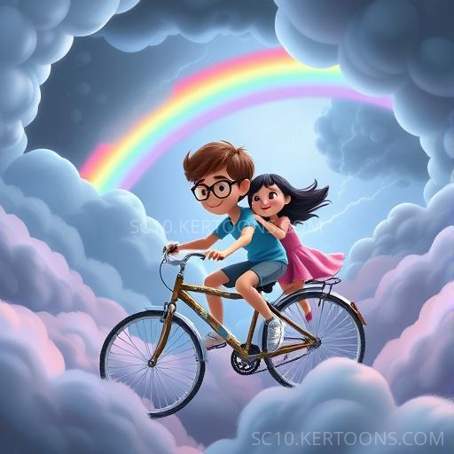 Holding on tight, Benny and Lily decided to go through the storm. Lightning flashed and thunder roared, but their magical bicycle glowed softly, guiding them safely through the swirling clouds. Inside the storm, they saw flashes of lightning and heard the rumble of thunder, yet they trusted their bicycle and each other. When they emerged, the sky cleared, revealing a brilliant rainbow stretching across the sky. Benny and Lily cheered, their hearts swelling with pride—bravery had brought them to this magical moment.