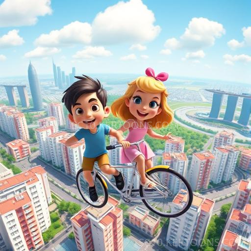 Benny eagerly hopped onto the shiny bicycle, and suddenly, it hummed softly and lifted off the ground! He felt a gentle rush as they soared above the rooftops, passing by tall HDB blocks and shimmering Marina Bay Sands. Lily, his cheerful and shy friend, hesitated at first but then decided to trust Benny. She climbed on, and together, they floated higher, feeling the wind in their hair and the thrill of the unknown. Their hearts pounded with excitement and a tiny bit of fear as they looked down at the bustling city below.